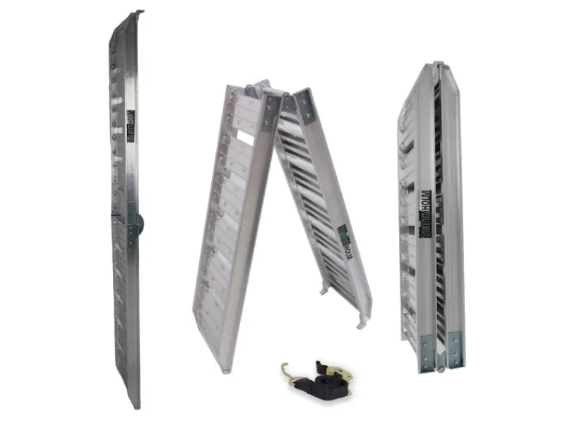 Dank der Klappfunktion und dem geringen Eigengewicht von 6,65 kg, kann die Rampe leicht getragen werden und ist außerdem schnell und einfach verstaut.Damit ist diese Auffahrrampe auch perfekt um sie unterwegs dabei zu haben.Durch die geringe Größe in zusammengeklapptem Zustand, können Sie die Rampe im Kofferraum, auf dem Anhänger oder im Transporter mitnehmen.Der mitgelieferte Gurt bietet dabei die Möglichkeit, die Rampe für den Transport zu sichern und so gegen Verrutschen zu schützen.Da die Rampe aus Aluminium gefertigt ist, hat diese eine lange Lebensdauer und ist witterungsbeständig.Trotz des geringen Eigengewichts, hat diese Verladerampe eine maximale Tragkraft von 200 kg und hat damit ein optimales Verhältnis von Tragkraft zum Eigengewicht.Besonders stabile, verzinkte Scharniere mit hoher TragkraftEigenschaften:sehr stabile Ausführung, massives Aluminiumhochwertige Verarbeitung an den Alu-Schweißnähtensehr breite Fläche mit geriffeltem Profil für einen sicheren Haltklappbar für platzsparenden Transport / Aufbewahrungangeschrägte Auflage und Zinken an der oberen Auflage für eine sichere Positionierung an Anhänger und TransporterTragkraft bis 200 kg / Rampe bei gleichmäßiger Verteilung der Last und einem Achsabstand >80cm (Luftbereifung aus Gummi)Maße: 180 x 29,5 x 9,5 cm (LxBxH) – Auffahrlänge: 175 cmzusammengeklappt nur 93 cm lang und 15 cm hochmin. Ladehöhe 35 cm bei 18 % Steigungmax. Ladehöhe 58 cm bei 30 % SteigungLaufflächenbreite: 29,5 cmGewicht: 6,65 kg (pro Rampe)Spanngurt mit Haken und Klemme, zum Sichern der Rampe am Anhänger oder Transporter