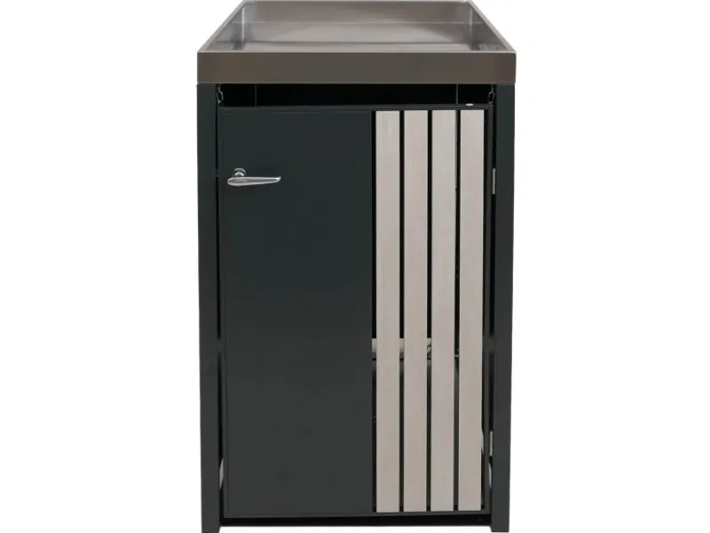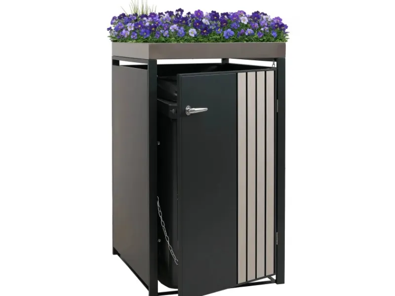Dank der robusten Bauweise aus verzinktem Stahl überzeugt die Mülltonnenverkleidung durch ihre Wetterbeständigkeit und lange Lebensdauer. Die abschließbaren Türen schützen den Inhalt zuverlässig, während Belüftungsschlitze eine optimale Luftzirkulation gewährleisten. Durch das klare, moderne Design fügt sich die Verkleidung harmonisch in jede Umgebung ein – ob im Garten, an der Hauswand oder in der Einfahrt. Eine praktische und zugleich ästhetische Lösung, um Ordnung und Stil im Außenbereich zu schaffen.