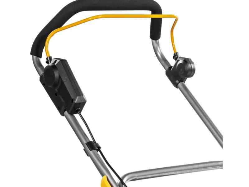 Darüber hinaus kann der Lenker zusammengeklappt werden, um den Rasenmäher bei der Lagerung platzsparend zu verstauen. Der Rasenmäher selbst ist mit einem integrierten Griff ausgestattet, der das Bewegen vor und nach dem Gebrauch erleichtert.