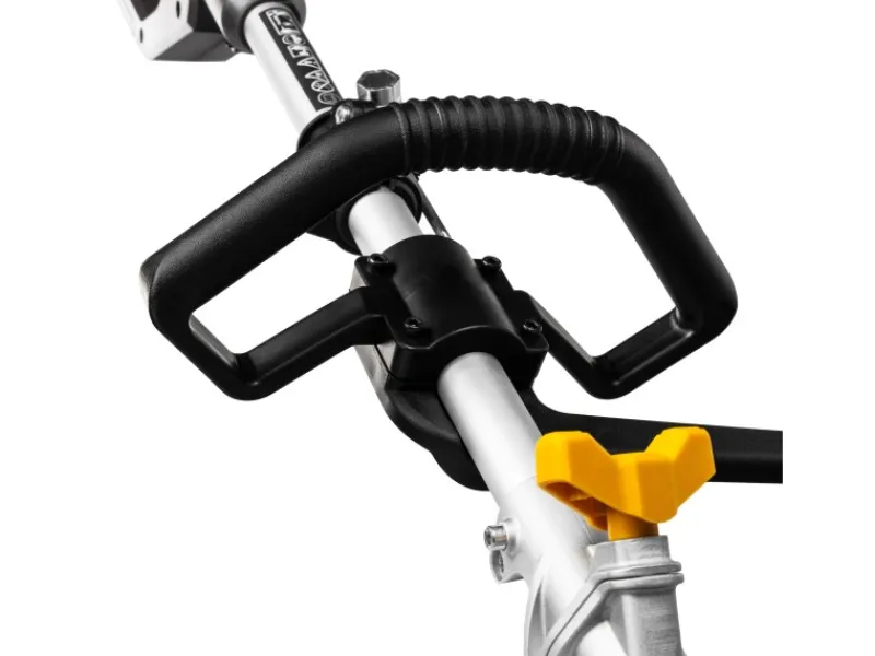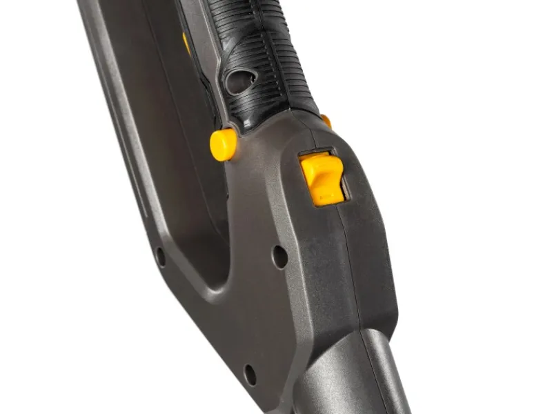 Am Bediengriff oben finden Sie den Sicherheitsschalter und den Schalter, und beide müssen gleichzeitig betätigt werden, um den Freischneider zu starten, was das Risiko einer unbeabsichtigten Aktivierung verringert. Der Bediengriff ist außerdem mit Soft-Grip ausgestattet, was das Halten angenehm macht.