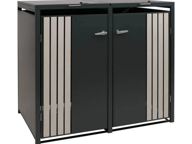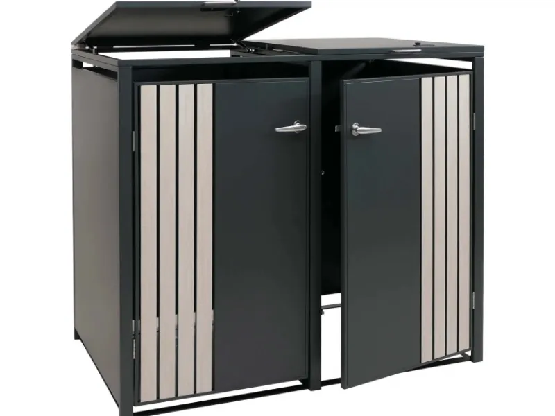 Dank der robusten Bauweise aus verzinktem Stahl überzeugt die Mülltonnenverkleidung durch ihre Wetterbeständigkeit und lange Lebensdauer. Die abschließbaren Türen schützen den Inhalt zuverlässig, während Belüftungsschlitze eine optimale Luftzirkulation gewährleisten. Durch das klare, moderne Design fügt sich die Verkleidung harmonisch in jede Umgebung ein – ob im Garten, an der Hauswand oder in der Einfahrt. Eine praktische und zugleich ästhetische Lösung, um Ordnung und Stil im Außenbereich zu schaffen.