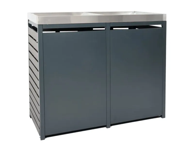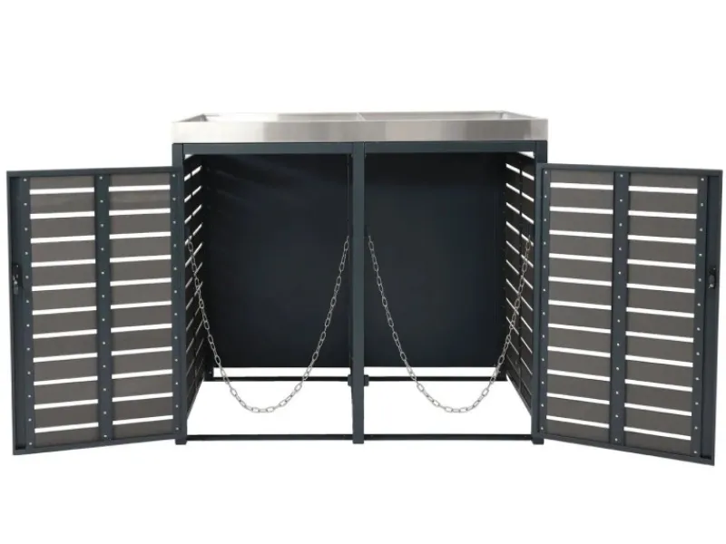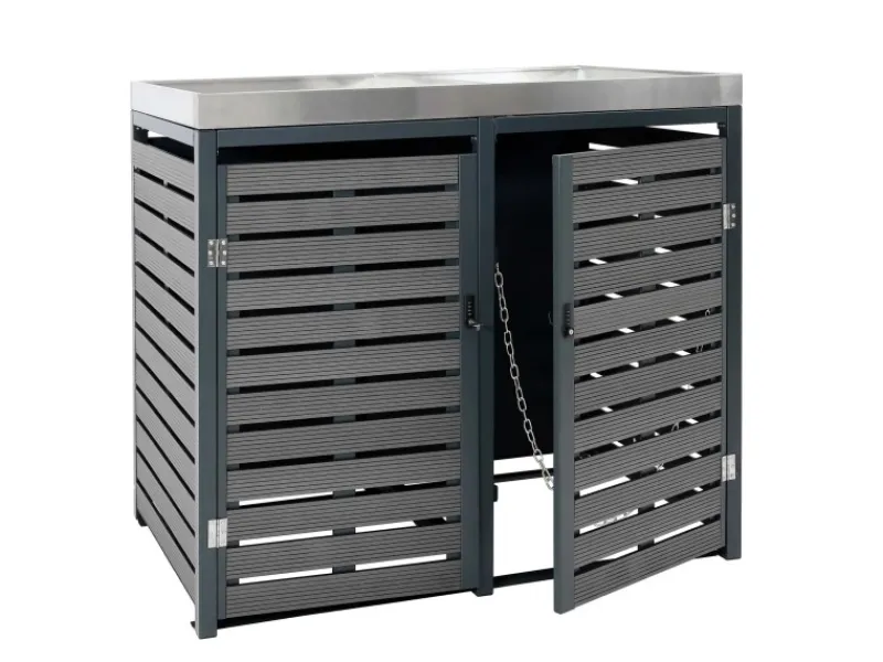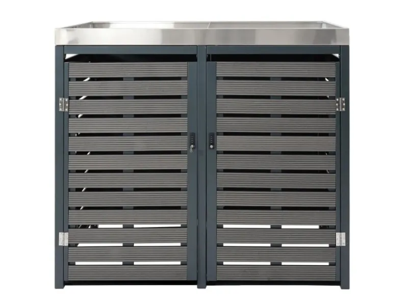 Die Kombination aus WPC-Paneelen und verzinktem Stahlrahmen sorgt für eine besonders langlebige und wartungsarme Konstruktion. Durch das klare, moderne Design fügt sich die Verkleidung harmonisch in jeden Außenbereich ein – ob Garten, Terrasse oder Einfahrt. Der Deckel lässt sich bequem öffnen, während die abschließbaren Türen für Sicherheit und Ordnung sorgen. Dank der Belüftungsschlitze bleibt das Innere stets gut durchlüftet. Eine stabile, pflegeleichte und optisch ansprechende Lösung, um Ihre Mülltonnen elegant zu verbergen und den Außenbereich aufzuwerten.