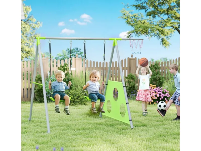 ● Zwei Schaukelsitze und ein Basketballkorb fördern das Gruppenspiel