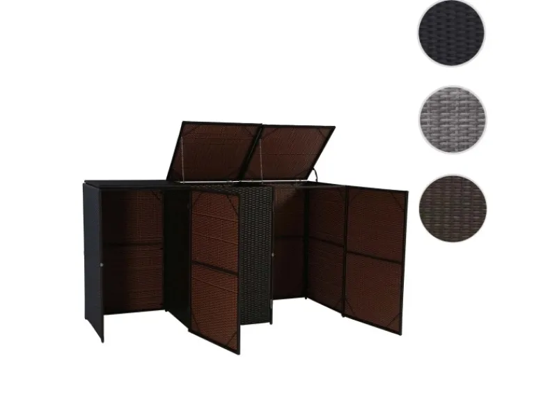 Die Mülltonnenbox überzeugt durch ihr durchdachtes Design und ihre hochwertige Verarbeitung. Der Klappdeckel bleibt dank Halterung sicher offen und erleichtert Dir das Befüllen der Tonnen. Das pflegeleichte Poly-Rattan verleiht der Box eine moderne Optik und ist gleichzeitig robust gegenüber Witterungseinflüssen. Eine clevere Lösung, um Ordnung und Stil in Deinen Garten, Hof oder Eingangsbereich zu bringen.