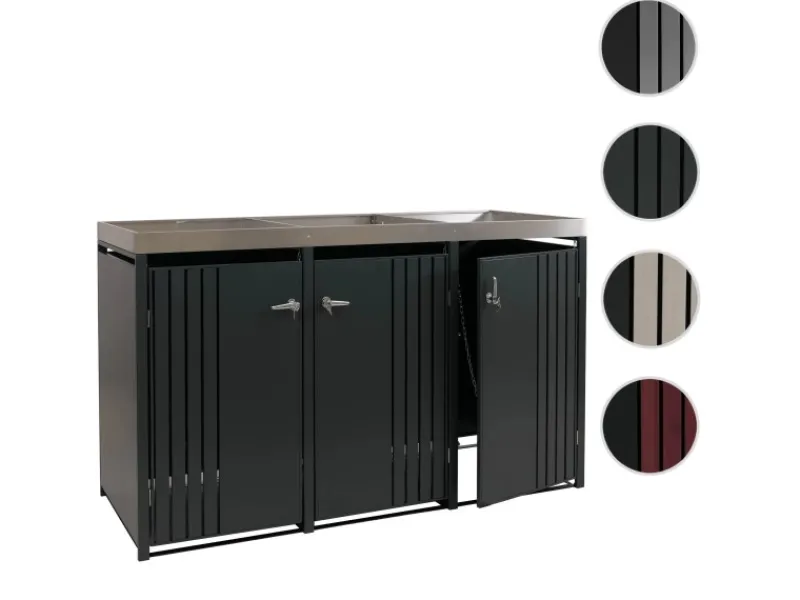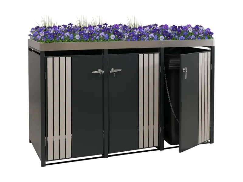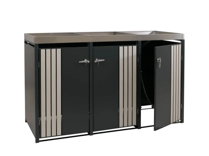Dank der robusten Bauweise aus verzinktem Stahl überzeugt die Mülltonnenverkleidung durch ihre Wetterbeständigkeit und lange Lebensdauer. Die abschließbaren Türen schützen den Inhalt zuverlässig, während Belüftungsschlitze eine optimale Luftzirkulation gewährleisten. Durch das klare, moderne Design fügt sich die Verkleidung harmonisch in jede Umgebung ein – ob im Garten, an der Hauswand oder in der Einfahrt. Eine praktische und zugleich ästhetische Lösung, um Ordnung und Stil im Außenbereich zu schaffen.
