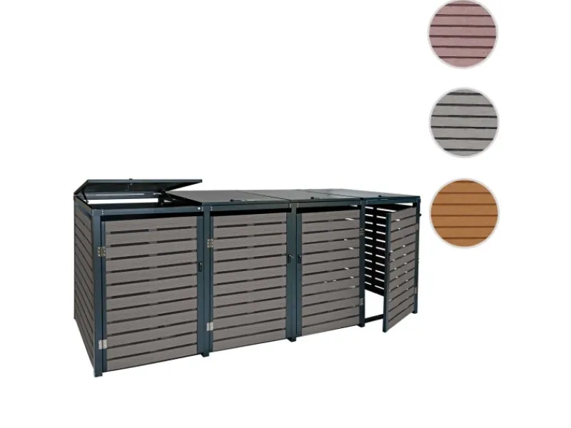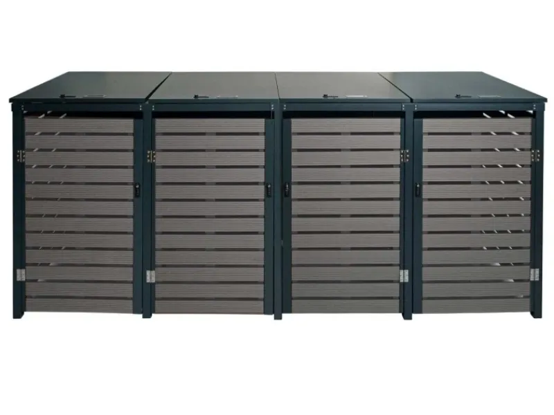 Die Kombination aus WPC-Paneelen und verzinktem Stahlrahmen sorgt für eine besonders langlebige und wartungsarme Konstruktion. Durch das klare, moderne Design fügt sich die Verkleidung harmonisch in jeden Außenbereich ein – ob Garten, Terrasse oder Einfahrt. Der Deckel lässt sich bequem öffnen, während die abschließbaren Türen für Sicherheit und Ordnung sorgen. Dank der Belüftungsschlitze bleibt das Innere stets gut durchlüftet. Eine stabile, pflegeleichte und optisch ansprechende Lösung, um Ihre Mülltonnen elegant zu verbergen und den Außenbereich aufzuwerten.