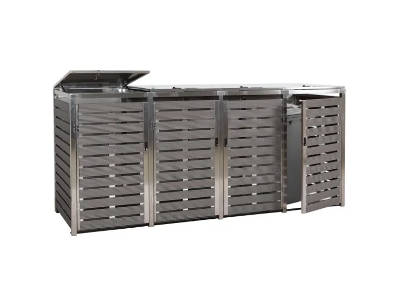 Die Kombination aus WPC-Paneelen und verzinktem Stahlrahmen sorgt für eine besonders langlebige und wartungsarme Konstruktion. Durch das klare, moderne Design fügt sich die Verkleidung harmonisch in jeden Außenbereich ein – ob Garten, Terrasse oder Einfahrt. Der Deckel lässt sich bequem öffnen, während die abschließbaren Türen für Sicherheit und Ordnung sorgen. Dank der Belüftungsschlitze bleibt das Innere stets gut durchlüftet. Eine stabile, pflegeleichte und optisch ansprechende Lösung, um Ihre Mülltonnen elegant zu verbergen und den Außenbereich aufzuwerten.