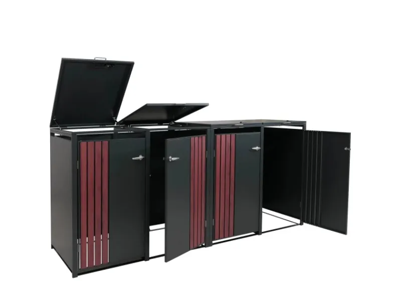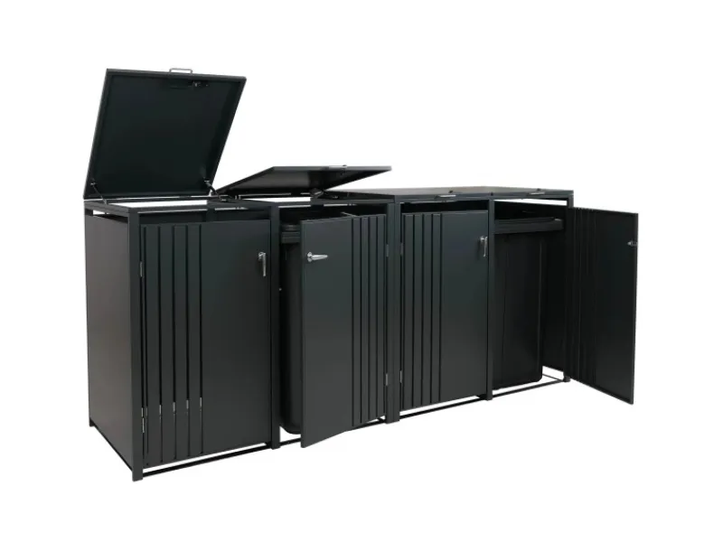 Dank der robusten Bauweise aus verzinktem Stahl überzeugt die Mülltonnenverkleidung durch ihre Wetterbeständigkeit und lange Lebensdauer. Die abschließbaren Türen schützen den Inhalt zuverlässig, während Belüftungsschlitze eine optimale Luftzirkulation gewährleisten. Durch das klare, moderne Design fügt sich die Verkleidung harmonisch in jede Umgebung ein – ob im Garten, an der Hauswand oder in der Einfahrt. Eine praktische und zugleich ästhetische Lösung, um Ordnung und Stil im Außenbereich zu schaffen.