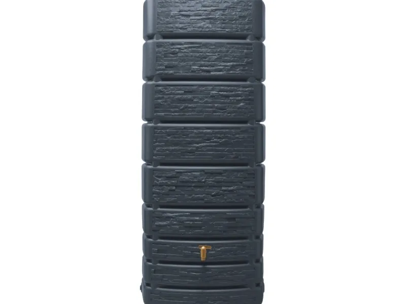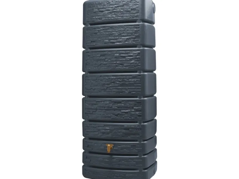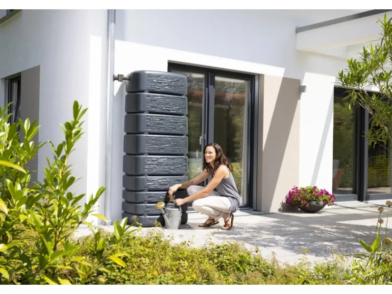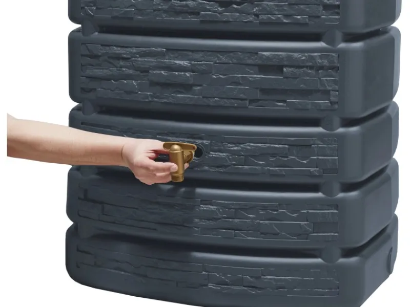 Regenwasserbehälter, Kunststoff-Auslaufhahn Aqua-Quick in Messingoptik, Zulaufdichtung DN 19/32, Windsicherung (Flachband).