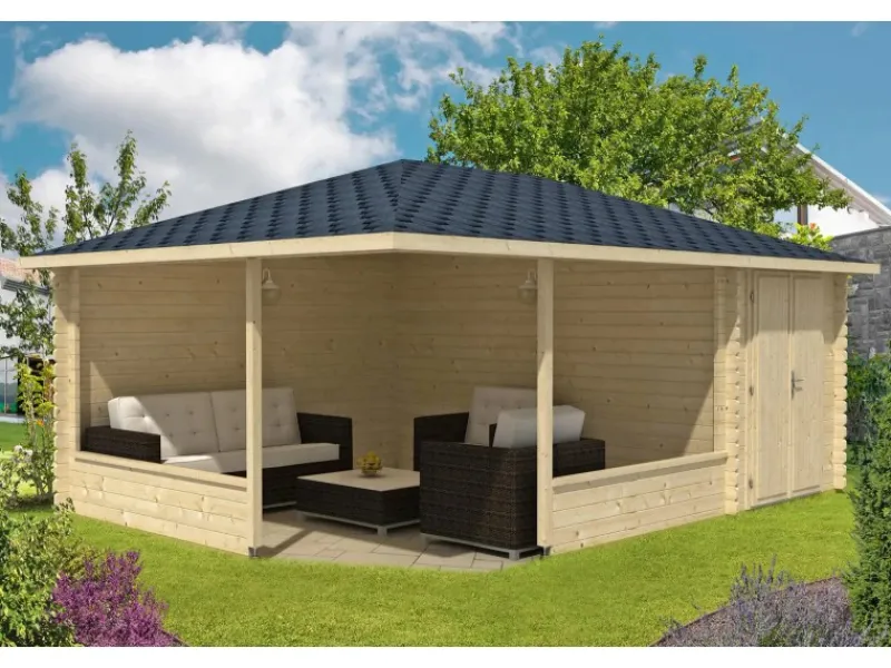 Mit einer Nutzfläche von 12,5 m² kann der Holzpavillon vielfältig genutzt werden. Mit einer Gartenlounge entsteht ein gemütlicher Rückzugsort zum Entspannen und Verweilen. Weiterhin eignet sich die Gartenhütte hervorragend als Poolhaus und bietet Ihnen einen praktischen Unterschlupf. Auch als Grillpavillon für gesellige Abende unabhängig des Wetters macht die Gartenlaube einiges her. Im angrenzenden Geräteschuppen mit einer Nutzfläche von 6,51 m² können Sie Poolzubehör, Gartenauflagen, Grillzubehör und andere Utensilien geschützt verstauen.