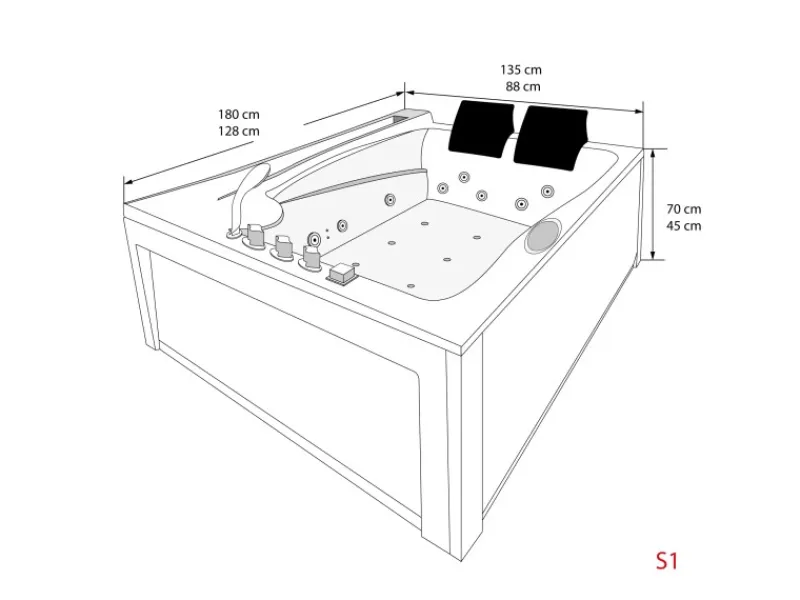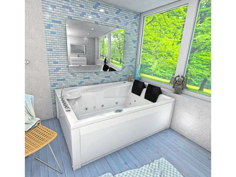 Ein Whirlpool der neuesten Generation erwartet Sie. Der Pool wird Ihnen nach Vorprüfung und Komplettmontage anschlussfertig ausgeliefert. Die Außenmaße des Pools: 180cm x 135cm x 70cm (LxBxH). Für zwei Personen ausreichend Platz, Wasserbedarf nur 180-200 Liter mit einer Person im Pool, bei zwei Personen weniger. Der einmalige Wasserfall wird zum Befüllen der Wanne benutzt. Der Pool verfügt über besonders leistungsstarke Pumpen (Luft & Wasser). Der Pool wird aus 100% Acryl (glasfaserverstärkt) hergestellt, KEIN ABS oder Mix aus anderem Material. Aus Acryl kann man Kratzer besser entfernen, da sieht dann der Pool auch nach vielen Jahren noch wie neu aus! Ausstattung: – mit Heizung 1500W mit Temperaturwahl zum Halten der Wassertemperatur über Stunden – Air-Pumpe 350W für Luftsprudel – Wasser-Pumpe 900W für Wassermassage – Stromanschluss 220V-240 / 50Hz – Steuerungsdisplay für alle elektrischen Funktionen, Bluetooth-Radio mit Lautsprecher – 1x Farblichtspot mit 7 Farben unter Wasser – 2 schwarze Nackenkissen – komplettes Armaturen-Set mit herausziehbarer Brause – Wassereinfüllsystem mit Farbwechsler und zweifacher Wasserfall – Ringzirkulation über den Wasserfall – komplette Armaturen bereits eingebaut – Wasserfall, Ab- und Überlaufgarnitur, sowie mit herausziehbarer Handbrause – Auslieferung komplett anschlussfertig inkl. Schürze – Rahmen aus Stahl Vollverzinkt mit höhenverstellbaren Füßen – 14 Düsen für Wassermassage / 4 einzeln verstellbare Turbojets, sowie 8 starre Rückenjets – 12 Air-Jets für Luftsprudel im Boden – passive Restwasserentleerung – ein Wasserstandssensor zum Schutz der Pumpe – Stellvariante C: geliefert werden die lange Schürze vorn, sowie die kurze Schürze an der Armatur – Abflussanschluss HT50/40 im Lieferumfang – dieser Pool passt im Ganzen durch eine 82 cm Standard-Tür. Jeder Pool wird bei uns im Lager vor dem Versand ausgepackt und einer optischen Prüfung unterzogen. Anschließend wird der Pool auf einem speziellen Prüfstand mit Wasser gefüllt und das ganze System auf Dichtheit überprüft. Ebenfalls geprüft werden die Pumpen, das Licht und alle anderen elektrischen Funktionen. Erst dann wird der Pool erneut verpackt und versendet. Der Pool kommt komplett endmontiert, es muss nur noch Strom, Wasser und Abwasser angeschlossen werden, FERTIG.
