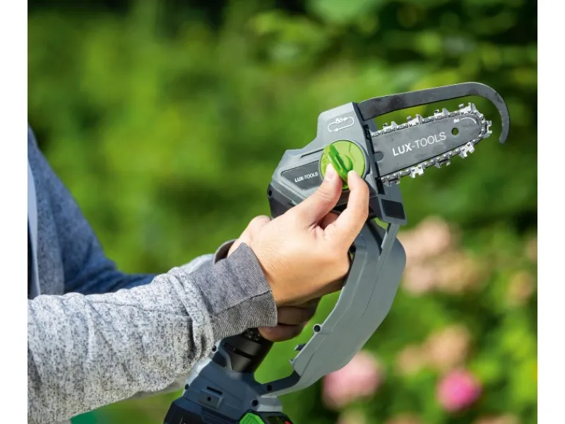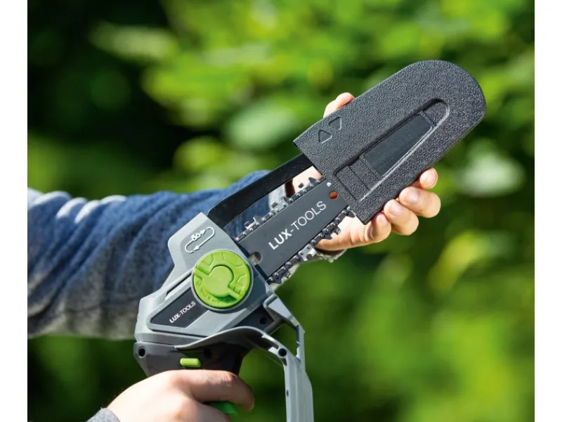 Trotz des kompakten Designs erzielt die Akku-Astsäge eine hohe Kettengeschwindigkeit von 4,7 m/s. Das Schwert mit einer Gesamtlänge von 15,6 cm ist ausreichend, um auch dickere Äste mit einem Durchmesser bis maximal 11 cm zu zersägen.