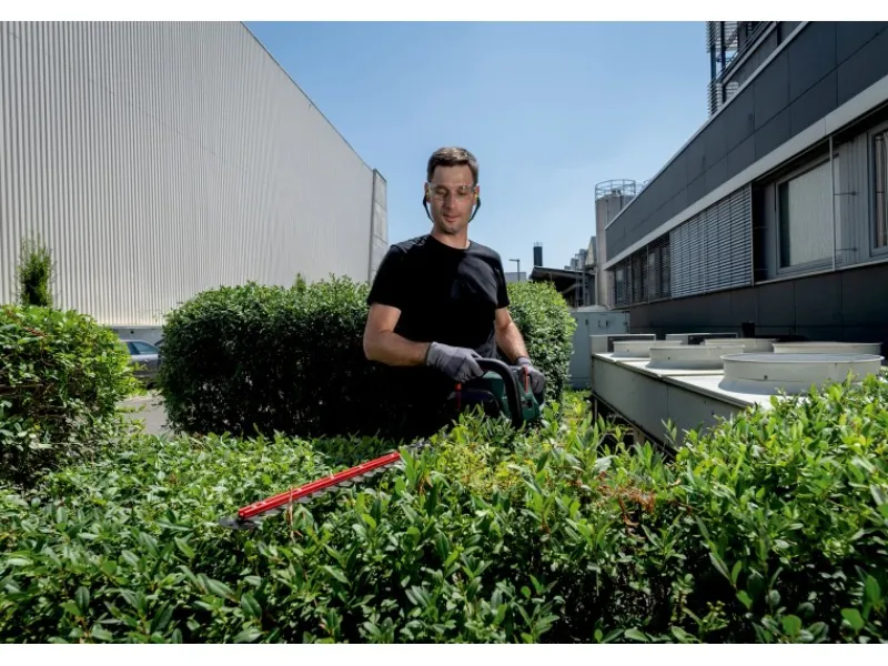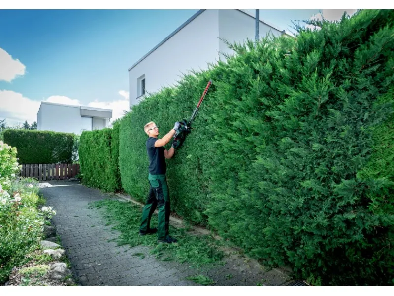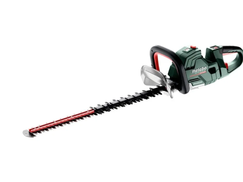 Die Metabo Akku-Heckenschere HS 18 LTX BL 65 ist eine kraftvolle, bürstenlose Heckenschere mit einem drehbaren Griff für komfortablen Trimm- und Rückschnitt. Ausgestattet mit einem starken Brushless-Motor bietet sie maximale Schnittleistung und eine lange Akkulaufzeit. Das hocheffiziente, präzise Dual-Schnittsystem verfügt über beidseitig diamantgeschliffene und lasergeschnittene Messerzähne. Der drehbare Handgriff mit 5 Positionen ermöglicht ein sicheres und flexibles Führen der Heckenschere. Die komfortable Zweihand-Bedienung wird durch einen langen Schalterdrücker und einen innenliegenden Bügelgriffschalter gewährleistet. Für sicheres Arbeiten sorgt die perfekte Balance der Heckenschere, der Softgrip-Handgriff, der Griffschutz am Messer und der Schnellstopp (in 0,2 Sekunden). Die integrierte Vibrationsdämpfung Metabo VibraTech (MVT) ermöglicht gesundheitsschonendes Arbeiten im Dauerbetrieb. Das zentrale Bedienpanel verfügt über einen ON/OFF-Sicherheitsschalter mit Standby-Funktion und LED-Kontrollanzeigen. Die Metabo S-automatic Sicherheitskupplung schützt Messer und Getriebe bei Blockieren durch Fremdkörper. Das Magnesium-Getriebegehäuse und die geschützte Position des Akkupacks machen die Heckenschere robust im Einsatz. Ein Anstoßschutz schützt Anwender und Getriebe vor Rückschlägen bei Arbeiten in Wand- und Bodennähe. Die praktische Aufhängeöse ermöglicht eine platzsparende Aufbewahrung an der Wand. Durch den Akkubetrieb ist die Heckenschere leise, wodurch sie auch in lärmsensiblen Bereichen eingesetzt werden kann. Die Heckenschere ist kombinierbar mit allen 18V-Akkupacks und Ladegeräten der CAS Marken. Im Lieferumfang ist der Messerschutzköcher. Der Akkupack un das Ladegerät sind nicht im Lieferumfang enthalten.