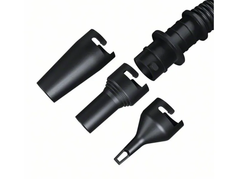 Die kompakte Luftpumpe wird mit drei Düsen für Ventile unterschiedlicher Größe und einer Aufbewahrungstasche für einen leichten Transport zum Pool, See oder Zeltplatz geliefert.