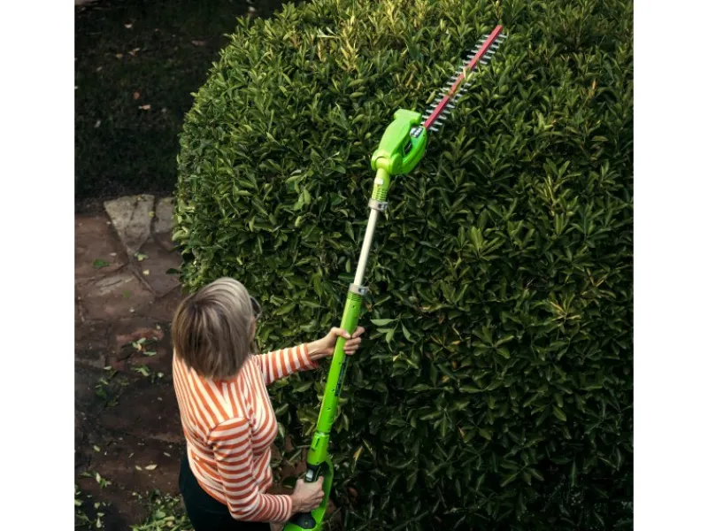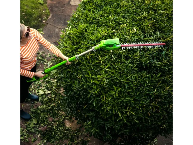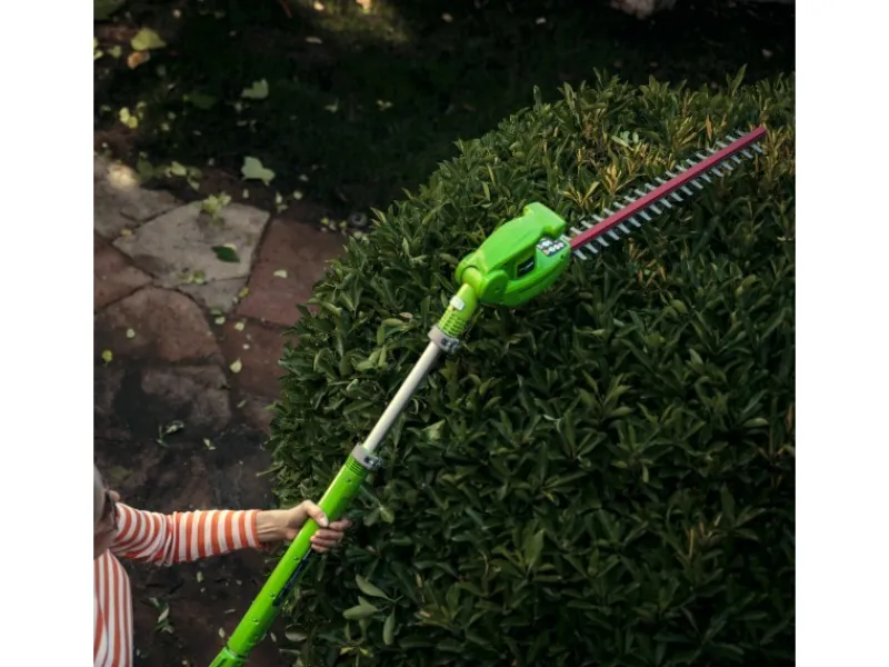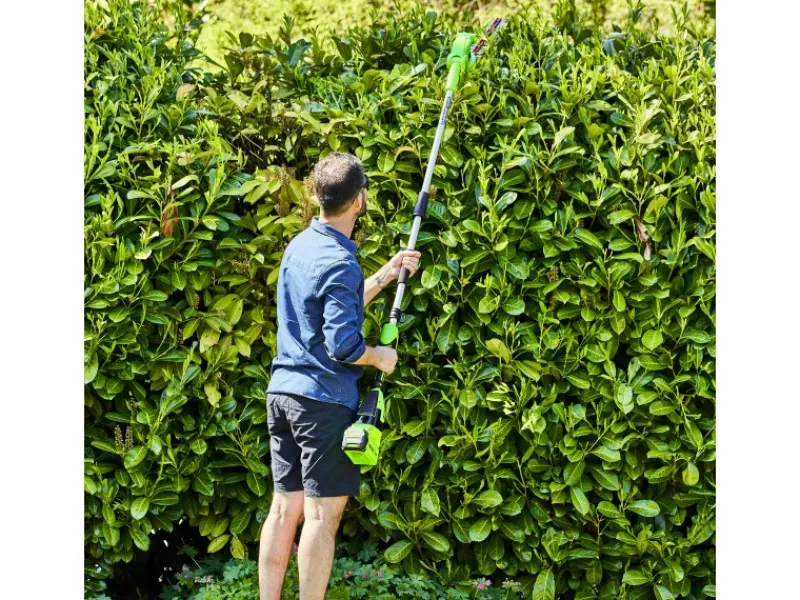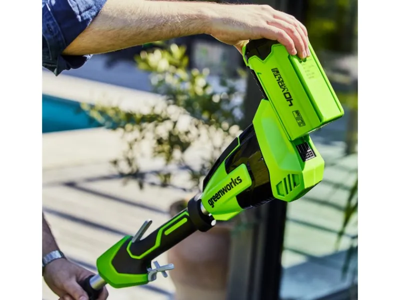 Die Heckenschere wird mit einem 40 V-Lithium-Ionen-Akku betrieben. Als Teil der Greenworks 40V-Familie ist der Akku flexibel und kann in allen anderen passenden Geräten wie Rasenmähern, Blasgeräten oder Kettensägen eingesetzt werden.