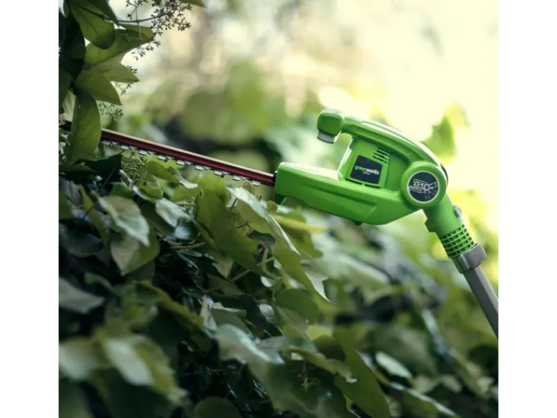 Kompakter Hochentaster mit 125° schwenkbarem Trimmerkopf erleichtert das Schneiden an hohen Hecken