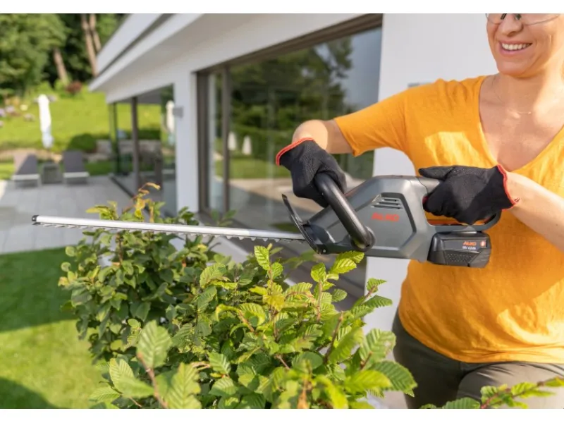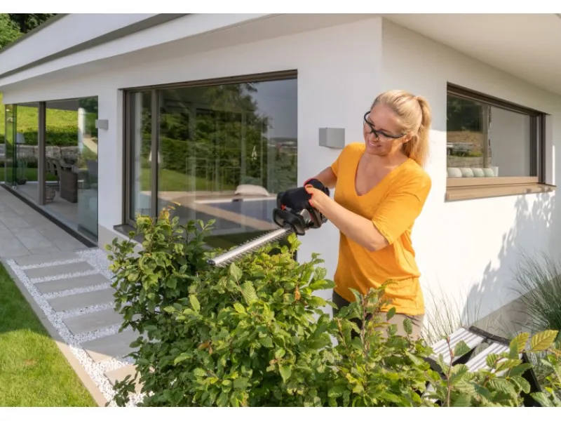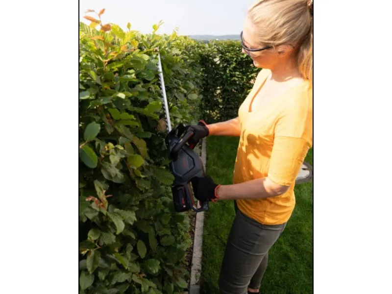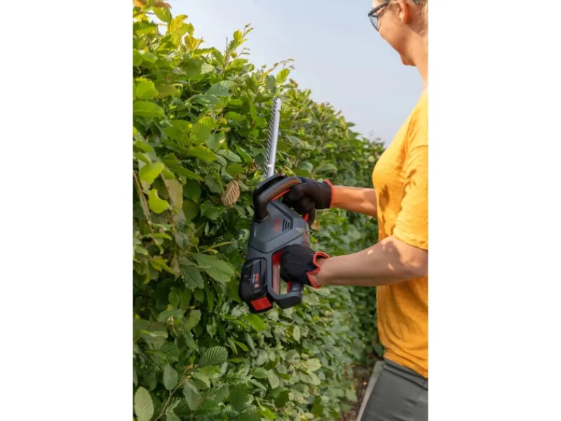 Die Akku-Heckenschere HT 1845 ist mit nur 2 kg (ohne Akku) deutlich leichter als jedes Benzinmodell. Das Gerät mit dem vibrationsarmen E-Motor und guter Gewichtsverteilung sowie den ergonomischen Griffen ermöglicht eine top ausbalancierte Geräteführung und besonders ermüdungsfreies Arbeiten, etwa an hohen Hecken.