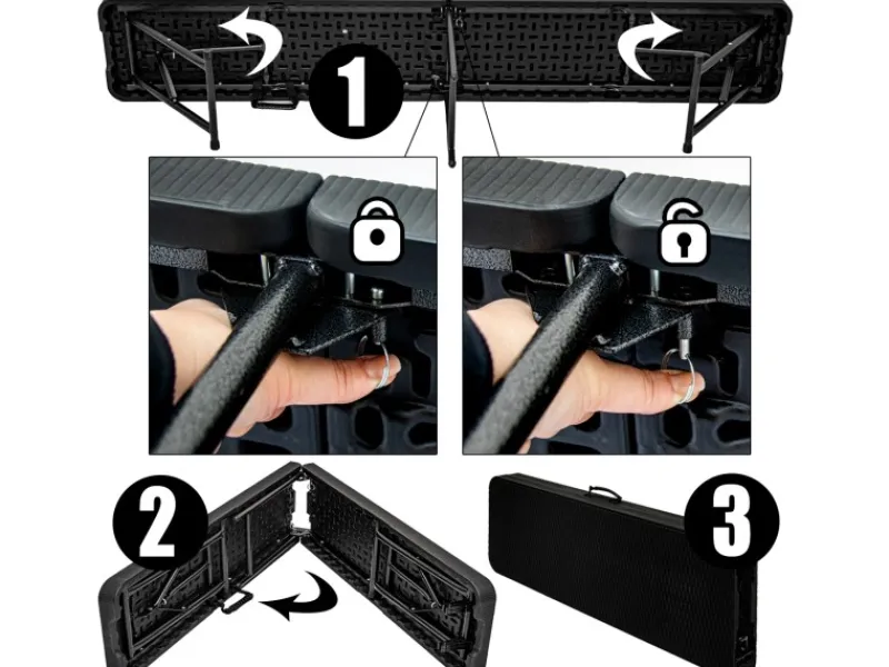 Die mobile Klappbank ist im Handumdrehen aufgebaut. Am Griff kannst Du sie wie einen Koffer transportieren – eine Bank wiegt nur 8,3 kg.