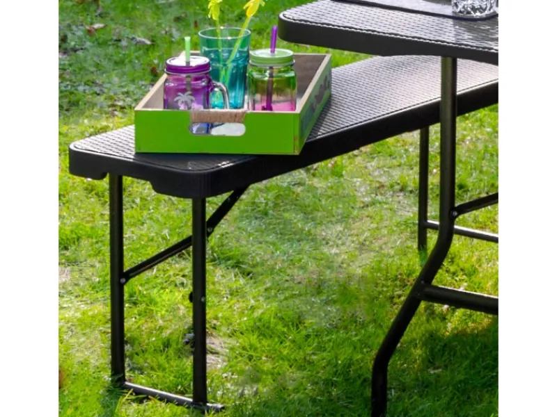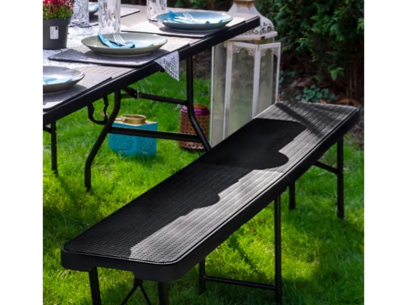 In Schwarz mit Flechtmuster passt die Partybank garantiert auch in Deinen Garten – Schmutz oder Flecken werden einfach abgewischt.