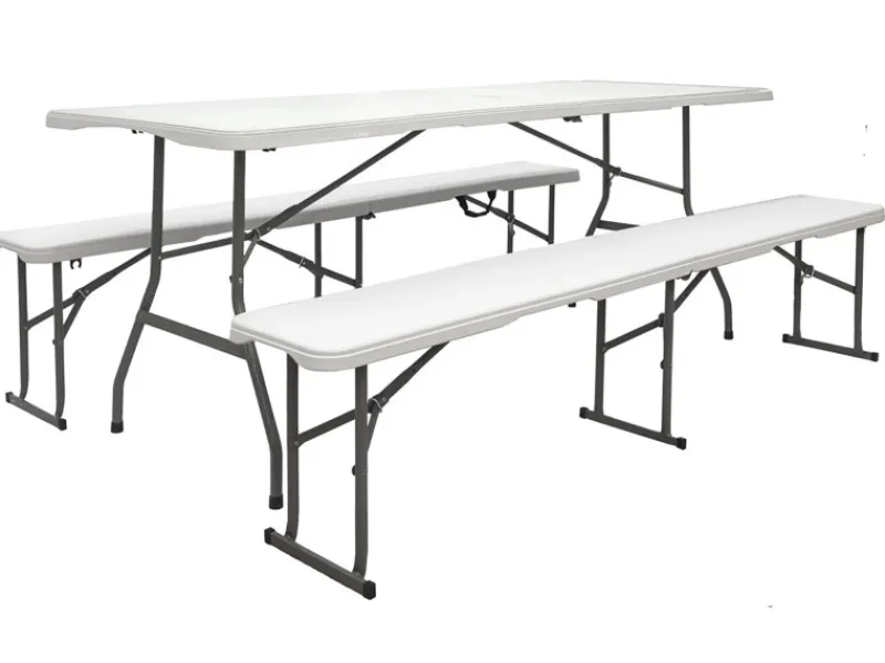Wetterfeste Bierzeltgarnitur inklusive zwei Bierbänke in elegantem Weiß und pflegeleichter als Holz.
