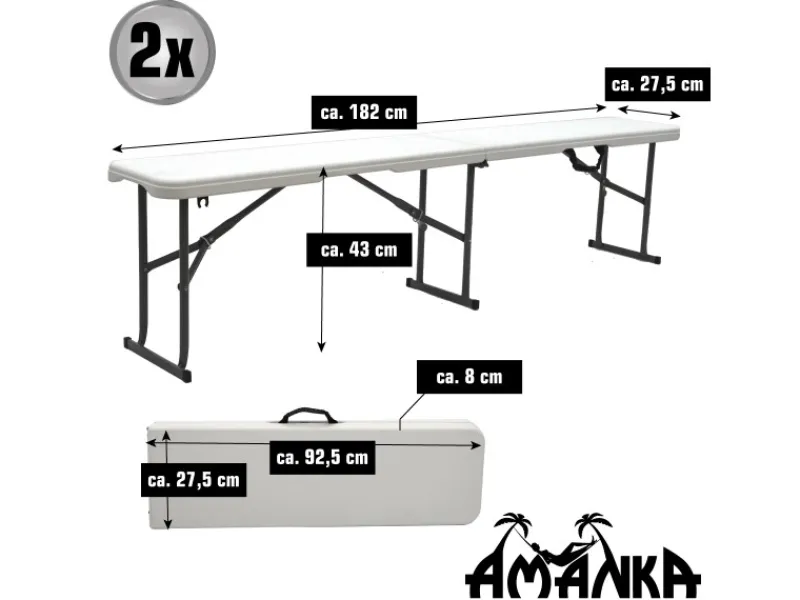 Am Tisch haben 8 Personen Platz, die Bänke sind ca. 182 x 27,5 x 43 cm groß.