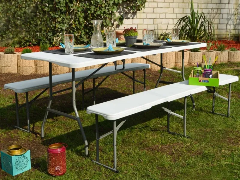 Der verstärkte Tragegriff macht aus der Festzeltgarnitur einen Partytisch zum Mitnehmen.