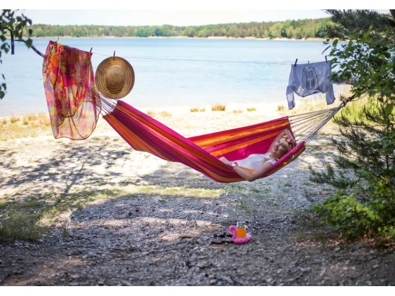 Die original brasilianische Hängematte Santana von Amazonas mit liebevoll handgearbeiteten Details verbindet brasilianische Handwerkskunst mit leuchtenden Farben und kuschelig weichen, stabilen Fäden. Damitwird selbst eine weniger große Hängematte wirklich bequem! Tief durchhängen lassen und diagonal reinlegen, so ist es am gemütlichsten.