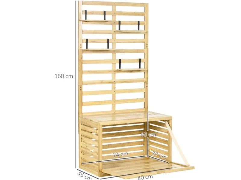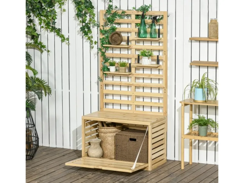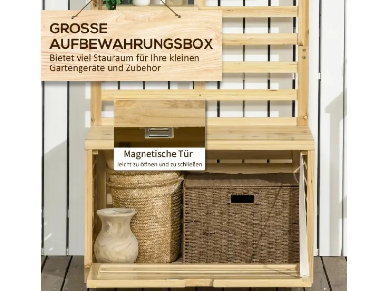 Diese praktische, rustikale Allwetter-Terrassenbox von Outsunny ist eine großartige Ergänzung für Ihren Außenbereich. Sie bietet reichlich Stauraum für Outdoor-Spielzeug, Gartengeräte und vieles mehr. Das integrierte Spalier bietet hervorragenden Halt für Kletterpflanzen und vier kompakte Regale, die sich flexibel überall einhaken lassen. Aus Massivholz gefertigt und wetterfest lackiert, ist diese Möbelkombination besonders langlebig und wird Ihnen eine lange Zeit treu dienen.