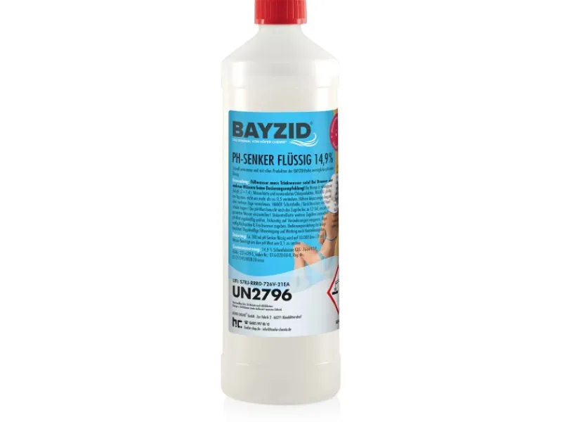 Schnell wirksamer und mit allen Produkten der BAYZID Reihe verträglicher pH Senker flüssig. Dieses flüssige pH Minus ist nicht nur effektiv, sondern auch lagerstabil und besonders rein. Alle unsere Kanister und Flaschen dieses Produkts wurden mit Kindersicherheitsverschluss ausgestattet, den Sie durch gleichzeitiges herunterdrücken und drehen öffnen können.