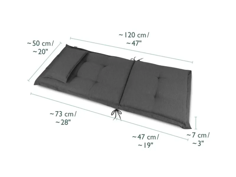 Produktdetails:Marke: Beautissu Serie: HighLux HL Maße: 120x50cm Stoff-Dicke: 7 cmStoffqualität: 200 g/m² Material Bezug: 100% Polyester Material Füllung: 100% Polyurethan Schaumplatte mit Polyestervlies ummantelt Rutschfest durch Befestigungsbänder Besonderheit: mit Kopfkissen Polster Extras: In verschiedenen Farben zur Auswahl auch als Gartenstuhlauflage Niedriglehner verfügbar