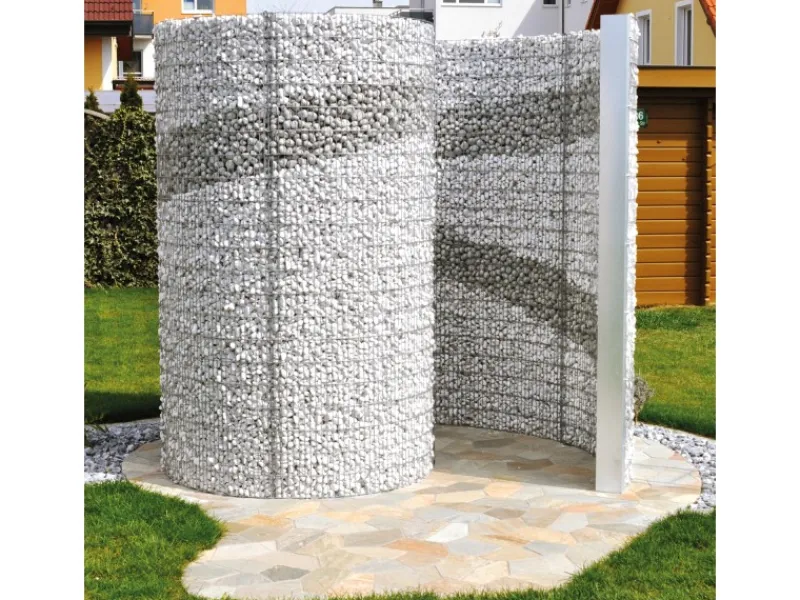 Der Gabionenkorb lässt sich ganz nach Ihren Wünschen mit verschiedenen Steinen befüllen. So können Sie den Look an Ihren Garten anpassen. Egal ob helle, dunkle oder farbige Steine. Das Gitter aus Zink-Aluminium verzinktem Stahldraht ist besonders langlebig, frostsicher und stabil. Die Schneckendusche wird als Bausatz inkl. 3 Pfosten zum Einbetonieren geliefert. Diese müssen durch ein Punktfundament oder mit einem Schraubflansch (separat erhältlich) befestigt werden.