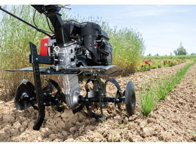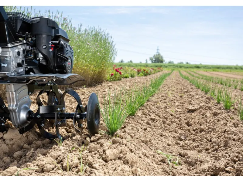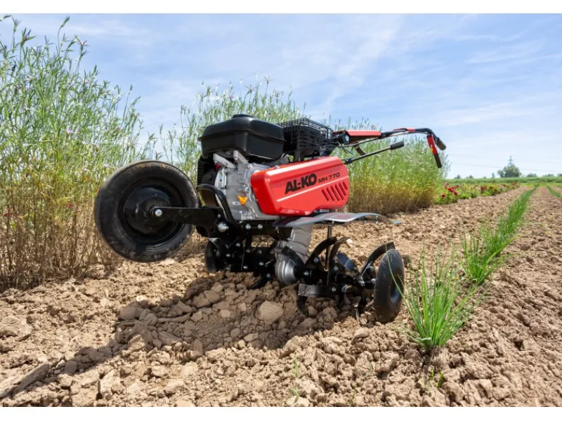 Die Motorhacke MH 770 Comfort unterstützt Sie kraftvoll bei der Bearbeitung größerer Flächen. Durch zwei Vorwärtsgänge können sie die Arbeitsgeschwindigkeit sowie das Hackergebnis bequem an Ihre Anforderungen anpassen. Der Rückwärtsgang erleichtert das Rangieren und ermöglicht eine kräfteschonende Bedienung. Mit einer Arbeitsbreite von 77 cm und den sechs Hackmessersätzen erreichen sie Arbeitstiefen von bis zu 33 cm. Denn die aktiv arbeitenden, speziell geformten vier Hackmesser sind hervorragend für Bodenbearbeitung konstruiert – und mit seinem 3,45 kW/4,7 PS-Motor verfügt das Modell über einen kraftvollen Durchzug auch auf schweren Böden. Mit dem Führungssporn bleibt das Gerät in der Bahn. An diese Motorhacke können gleich mehrere Zubehörteile angebaut werden, wie z.B. ein Häufel- oder Kartoffelpflug oder Beetpflug (separat erhältlich). Zur besseren Traktion empfiehlt es sich beim Verwenden von Pflügen, den ebenfalls angebotenen Stahlradsatz anzubauen.