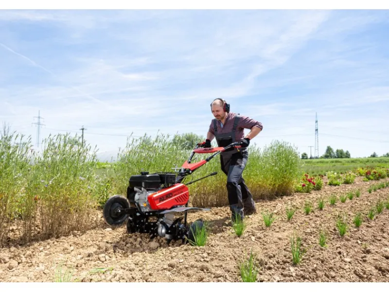 Ideal für das Arbeiten in schonender Körperhaltung ist der besonders stabile, ergonomische Führungsholm. Das Transportrad kann einfach und werkzeuglos von Arbeits- in Transportposition eingestellt werden. Dabei ist Sicherheit Trumpf: Durch den Sicherheitshandhebel wird das unbeabsichtigte Drehen der Hackmesser wirksam verhindert. Zudem schützt die qualitativ hochwertige Abdeckung der Hackwerkzeuge aus robustem Stahlblech den Geräteführer vor herumfliegenden Steinen und Erdreich.
