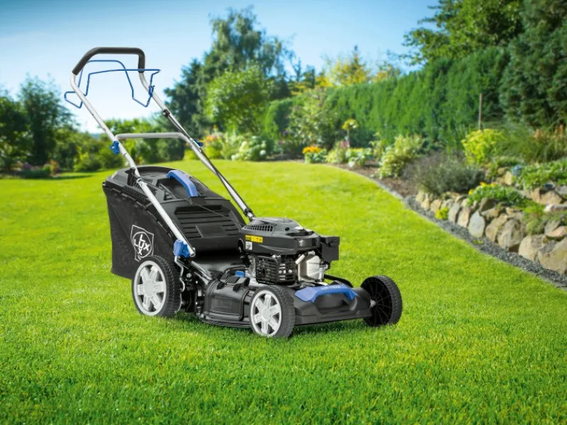 Für einen manuell zuschaltbaren Hinterradantrieb hat der Benzin-Rasenmäher einen ergonomischen Softgripp-Griff mit Antriebsbügel. Hiermit können Sie ihn angenehm und komfortabel führen. Dank der 7-fachen zentralen Höhenverstellung von 25 mm bis 75 mm lässt sich die Griffhöhe individuell an Ihre Körpergröße anpassen. Durch den praktischen Mulchkit können Sie das Schnittgut auch als Dünger auf den Rasen ausbringen. Darüber hinaus verfügt der Rasenmäher über einen großen Harttop-Auffangsack mit einem Volumen von 60 l, mit dem der Rasenschnitt automatisch eingesammelt wird. Dank der Füllstandsanzeige haben Sie den Füllstand des Auffangkorbes jederzeit im Blick.