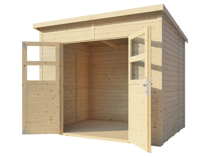 Die Konstruktion des Gartenhauses ist äußerst stabil, mit einer Wandstärke von 19 mm und einem Pultdach, das eine maximale Schneelast von 87 kg/m² trägt. Der Aufbau gestaltet sich dank der praktischen Elementbauweise einfach und unkompliziert, sodass auch Hobby-Handwerker die Montage problemlos durchführen können.