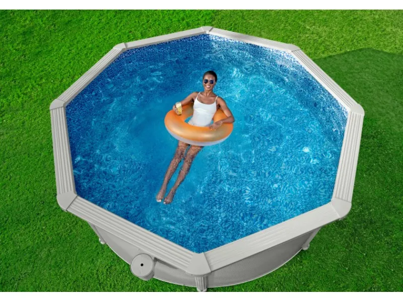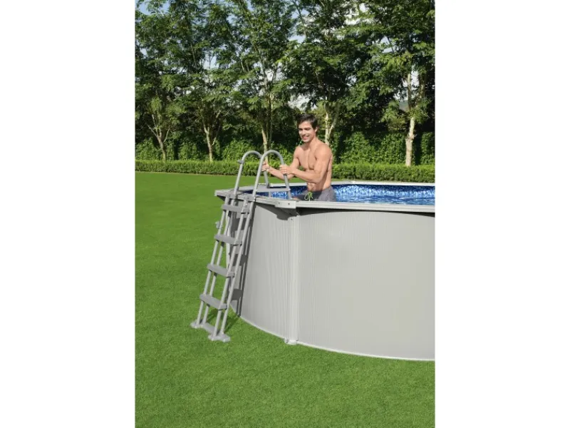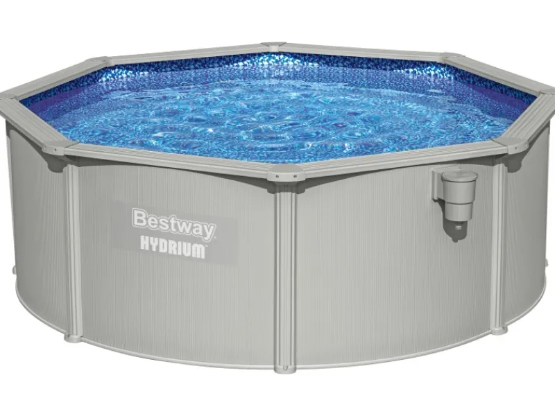 Der runde Hydrium™ Stahlwandpool (360 x 120 cm) von Bestway® kann das gesamte Jahr über aufgestellt bleiben. Neben den 0,3 mm starken, geriffelten Stahlwänden sorgt auch die UV-schutzbeschichtete Premium-Poolfolie dafür, dass das Schwimmbecken im modernen Grau allen Witterungen standhalten kann. Zusätzlicher Schutz bietet die hochwertige Abdeckplane aus robustem PVC. Der große Stahlwandpool kann direkt auf der mitgelieferten Flowclear™ Bodenplane aufgebaut werden und mit 10.990 Liter befüllt werden – Wasser marsch! Der extra breite Handlauf kann als praktische Ablagefläche für Handtücher und weitere Utensilien genutzt werden. Für kristallklares Wasser sorgt nicht nur der integrierte Oberflächenskimmer, der sich um Laub und andere Verunreinigungen auf der Wasseroberfläche kümmert. Auch die leistungsstarke, GS-zertifizierte Flowclear™ Sandfilteranlage (3.028 l/h) sorgt für sauberes Wasser im gesamten Hydrium™ Stahlwandpool. Im Set enthalten sind zudem auch eine Sicherheitsleiter für einen leichten Aus- und Einstieg in den Pool und der ChemConnect™ Chemikaliendosierer, der für die richtige Verteilung der Poolchemie zuständig ist. Gezielte Wasserpflege und langjähriges Badevergnügen waren noch nie einfacher zu verbinden.