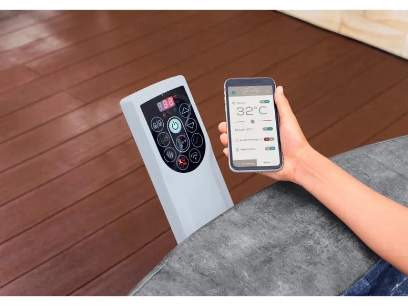 Das hochklappbare Bedienfeld lässt sich bequem per App steuern, sodass du alle Funktionen des Whirlpools von deinem Smartphone aus bedienen kannst. Der Energiespartimer ermöglicht die Heizplanung bis zu 40 Tage im Voraus, während die Abschaltautomatik zusätzliche Sicherheit bietet. Die integrierte Pumpeneinheit UltraFit spart Platz und macht die Wartung für eine integrierte Einheit erstaunlich einfach.