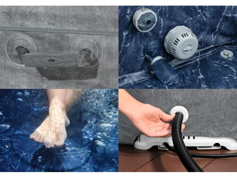 Für den Aufbau ist kein Werkzeug erforderlich. Die integrierten Tragegriffe ermöglichen es, den Whirlpool vor dem Befüllen mühelos frei zu platzieren. Das praktische Ablassventil sorgt dafür, dass das Wasser bequem und schnell abgelassen werden kann, was den Abbau und das Verstauen des Whirlpools erheblich erleichtert.