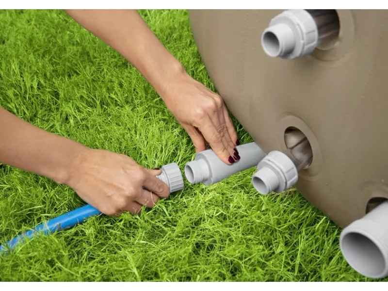 Der Außenwhirlpool ist mit der Multifunktionspumpe schnell und einfach aufgebaut. Nach dem Aufbau müssen Sie den Pool lediglich mit Wasser befüllen. Der Abbau gelingt über ein Ablassrohr mit Gartenschlauchadapter und Entlüftungsadapter. Der Whirlpool verfügt über ein integriertes Wasserfiltersystem mit Filterkartusche, das den Pool reinigt. Für sauberes Poolwasser sorgt der enthaltene ChemConnect Chemikaliendosierer, der den Chlorgehalt.
