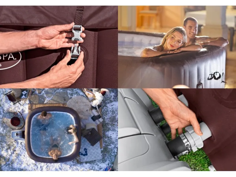 Für den Aufbau ist kein Werkzeug erforderlich. Dank der Tragegriffe und der Luftbefüllung mit der Pumpeneinheit lässt sich der Whirlpool mühelos auf und abbauen. Ein integriertes Ablassrohr mit Gartenschlauchadapter erleichtert die Entleerung.