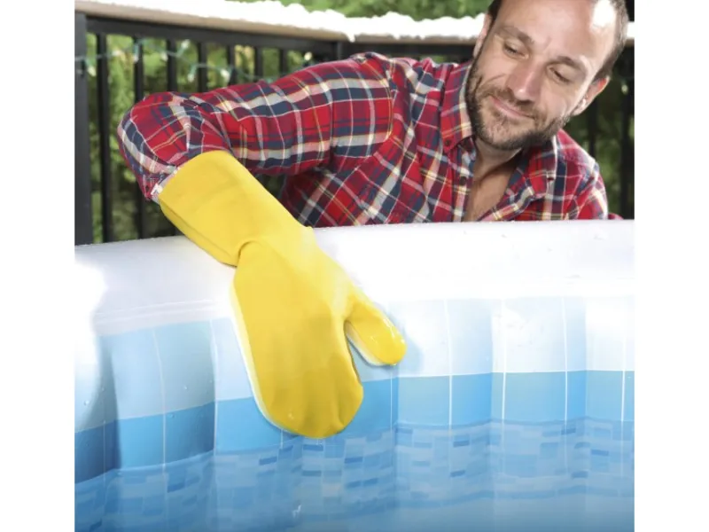Der Latex-Reinigungshandschuh ist mit einem praktischen Scheuerschwamm ausgestattet. So entfernen Sie zuverlässig Ablagerungen und Flecken von der Poolfolie. Ihre Hände bleiben dabei trocken und sind geschützt.
