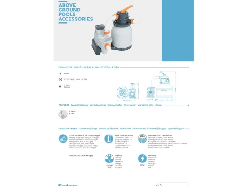Zu den wichtigsten Bestandteilen eines sauberen Swimmingpools gehört die Flowclear Sandfilteranlage von Bestway. Die Sandfilterpumpe lässt das Wasser im Pool zirkulieren, filtert & reinigt es. Die Kapazität der Pumpe mit Zeitschaltuhr liegt bei 5.678 l/h, 0,001577 m³/s (1.500 gal/l). Damit ist sie ideal zur Reinigung von Pools mit einer Kapazität von 1.100 l – 39.300 l geeignet. Sie besteht aus einem korrosionsbeständigen Filtertank. Das Ventil mit sechs Positionen ermöglicht eine einfache Filtersteuerung. Über den praktischen Timer können Sie eine automatische Arbeitsperiode einstellen. Der integrierte ChemConnect Chemikaliendosierer verteilt das Chlor gleichmäßig & sorgt für einen stabilen Gehalt der Poolchemie. Größere Partikel, wie Blätter, Haare & Schmutz werden mithilfe des Vorfilter-Siebkorbs aufgefangen. Dies schützt zudem das Pumpenlaufrad, was die Langlebigkeit & die reibungslose Funktion der Sandfilteranlage erhöht. Die Pumpe verfügt über einen RCD-Schutz-Stecker & ist kompatibel mit 3,2 cm (1,25″) & 3,8 cm (1,5″) Ventilen. Die obere Flanschklemme ermöglicht eine 360°-Drehung für eine schnelle & unkomplizierte Installation. Die Sandfilterpumpe arbeitet mit üblichen Sandkonventionen. Der erforderliche Quarzsand mit einer Größe von # 20 (0,45 mm – 0,85 mm, ca. 36 kg) ist separat erhältlich.