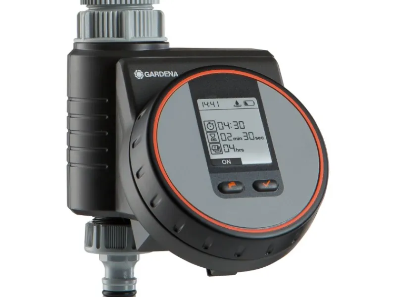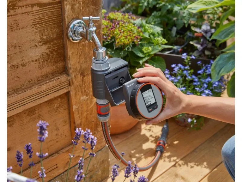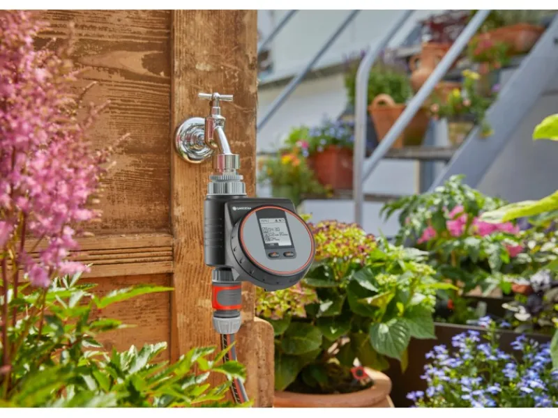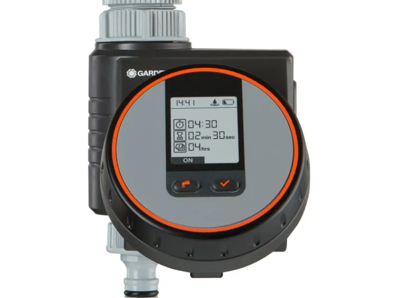 Mit der Gardena Bewässerungssteuerung Flex lässt sich die Bewässerung auf Balkonen, Dachterrassen oder Terrassen flexibel und einfach automatisch steuern. Die Steuerung ist batteriebetrieben, wird direkt an den Wasserhahn angeschlossen und lässt sich leicht über ein innovatives, außenliegendes Drehelement zur Auswahl der Daten und eine Bestätigungstaste bedienen. Ein gut lesbares LC Display zeigt alle Einstellungen auf einen Blick an. Die wetterbeständige Bedieneinheit ist abnehmbar. Durch extra kurze Bewässerungsdauer in Sekunden und bis zu 6-mal täglich ist die Bewässerungssteuerung ideal für die Verwendung mit einer Tropfbewässerung geeignet, für Pflanzen in Töpfen und Trögen auf Balkon und Terrasse. Water Now Funktion soll die Bewässerung einmal sofort gestartet werden, lässt sich diese manuell aktivieren, ohne das Gerät vom Wasserhahn zu entfernen oder Einstellungen zu verändern. Die Bewässerungssteuerung funktioniert durch die Safe Stop Technologie immer zuverlässig, ist der Energiestand der Batterie zu gering, um einen Bewässerungsvorgang komplett zu steuern, wird er gar nicht erst gestartet. Die Batterieanzeige im Display weist rechtzeitig darauf hin, wenn die Batterie ausgetauscht werden muss. Der Einsatz in Kombination mit einem Gardena Bodenfeuchtesensor ist möglich. Dieses Produkt garantiert für eine effiziente Bewässerung, denn jeder Tropfen zählt.