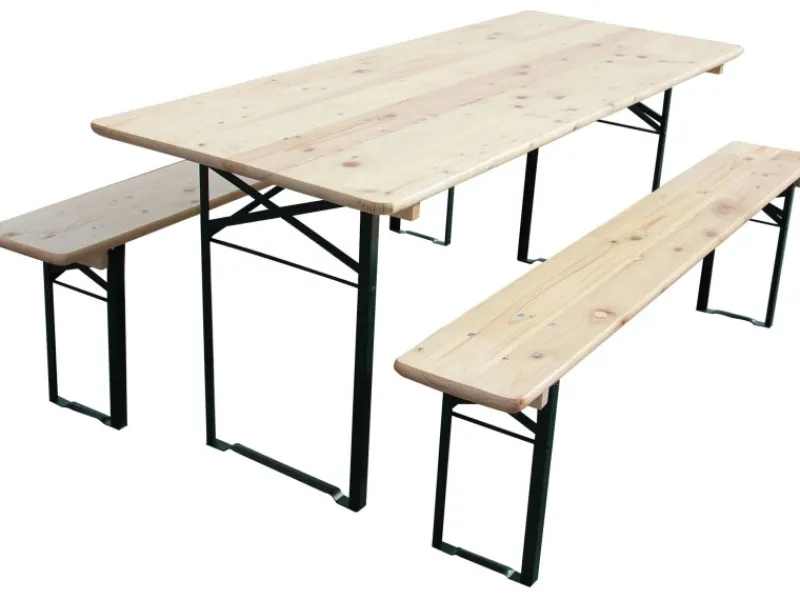 Tisch und Bänke klappbar für einfachen Transport und platzsparende Lagerung