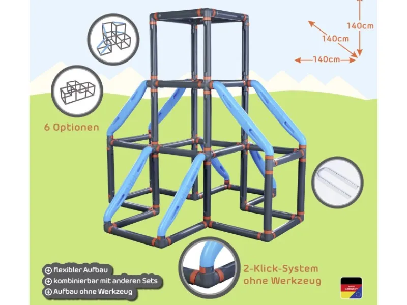 Der aufgebaute Kletterturm hat eine Höhe von 140 cm und besteht aus 3 Etagen. Es gibt jedoch zahlreiche flexible Aufbaumöglichkeiten, so dass Größe und Anzahl der Etagen entsprechend variieren können. Dadurch bleibt der Spielspaß stets abwechslungsreich und spannend.