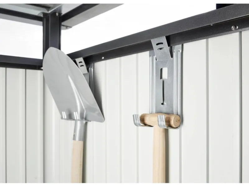 In der komfortablen Grundausstattung sind bereits zwei Regalböden mit entsprechenden Wandschienen enthalten. Hier können Sie beispielsweise Pflanzerde, Töpfe oder kleine Handwerkzeuge ablegen. Vier zusätzliche Gerätehalter dienen zum geordneten Aufhängen von Rechen, Spaten oder Schläuchen. Für die Innenseite der Türen sind zudem zwei Werkzeughalter enthalten.
