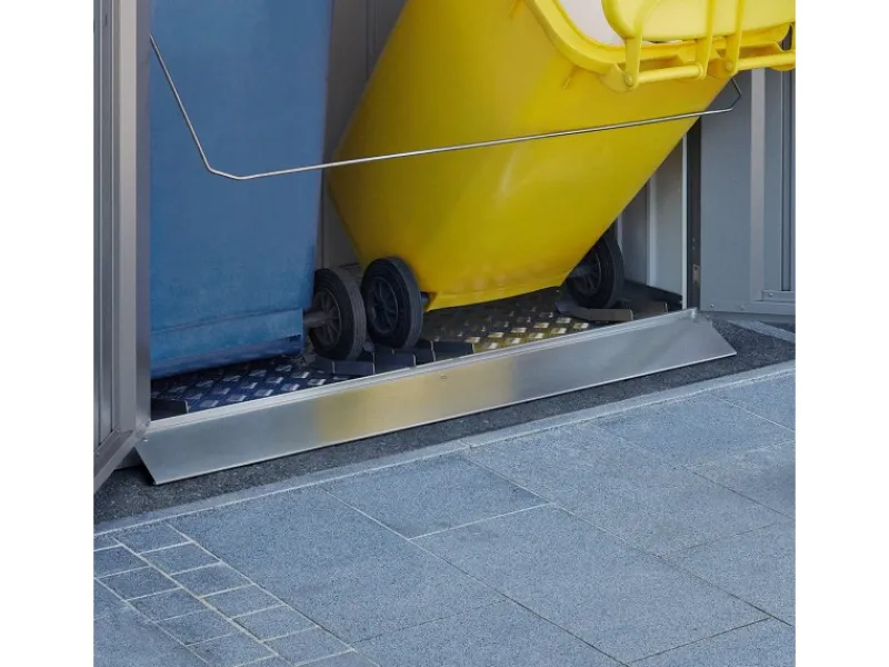 Das Biohort Boden-Set für Mülltonnenbox Alex Duo besteht aus einem Alu-Bodenrahmen, einer Alu-Bodenplatte und einer Bodenschwellen-Rampe. Die Alu-Bodenplatte dient als funktioneller Boden und wird mit XPS-Hartschaumplatten unterfüttert, die nicht im Lieferumfang enthalten sind.