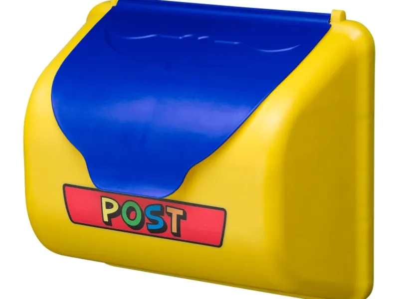 Der SwingKing Briefkasten ist Gelb mit blauem Deckel aus Kunststoff. Er wird vollständig mit Aufkleber geleifert.