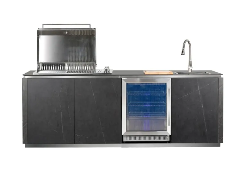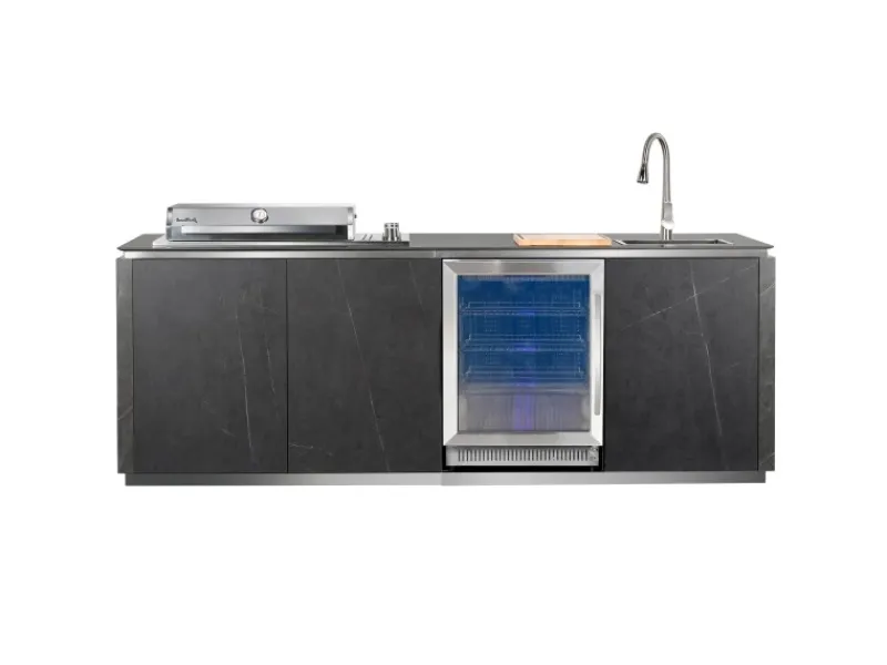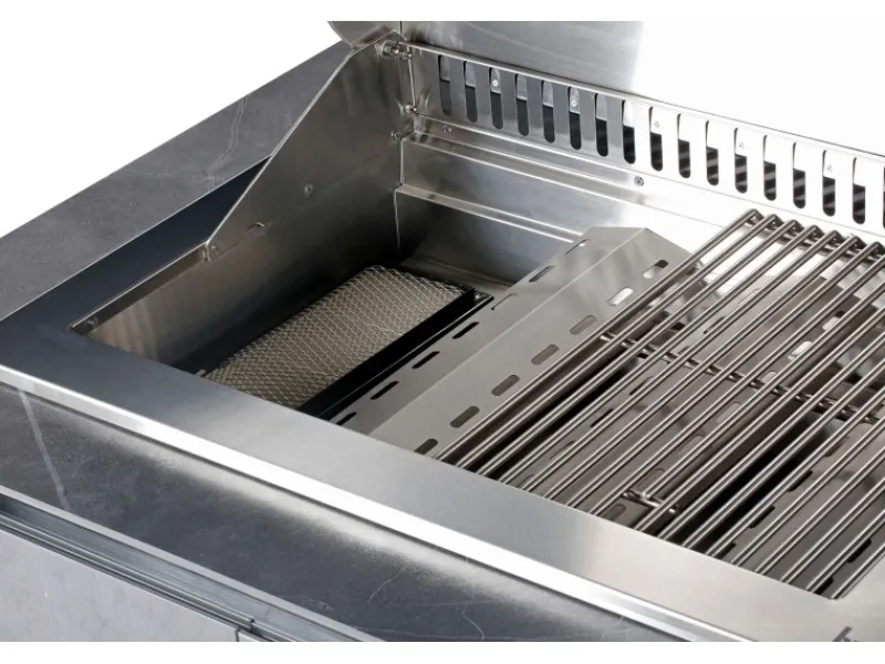 Die Korpus ist innen aus robustem Edelstahl gearbeitet und rundet das Design ab. Das Herz der Küche bildet der Gasgrill mit 3 leistungsstarken Edelstahl-Brennern und einem Infrarot-Brenner (Sizzle Zone), der vielfältige Grillgerichte ermöglicht.