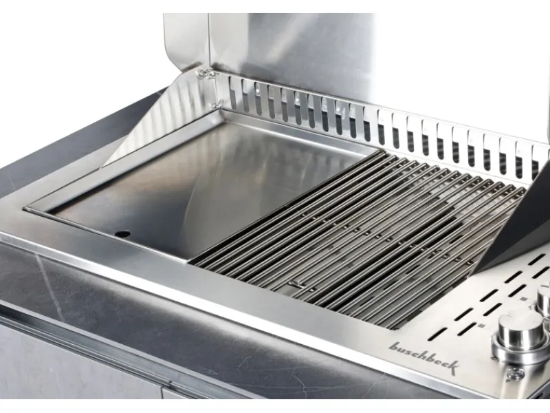– Ergänzendes Zubehör: Die Lieferung der Buschbeck Outdoorküche beinhaltet Anschlussschlauch, Gasdruckminderer, Schneidbrett aus Holz sowie eine Plancha-Platte aus Edelstahl, die den Gasgrill optimal ergänzt und die Zubereitung von kleinteiligem Grillgut ermöglicht